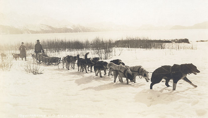 Dog sleds transported mail in some areas of the northern U.S. and the Alaskan Territory during winter months. Contract carriers used these sleds across Alaska from the late 19th century into the early 1920s. Isolated for much of the year, remote populations sometimes relied on dog sleds for contact with the outside world. Weight was a critical factor for the dogsāmail traveling on sleds was usually restricted to first-class pieces unless room was available for newspapers, magazines and packages. These items were otherwise left behind until spring, when they might be transported by steamboat or wagon.