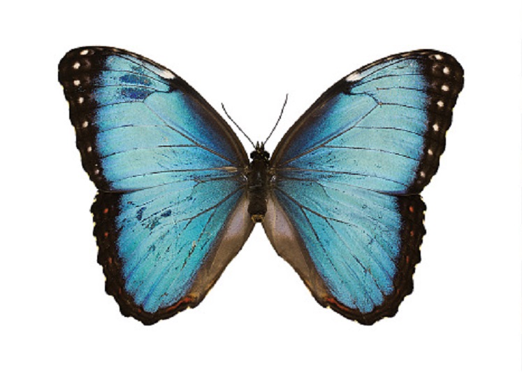Morpho butterflies such as the one pictured above owe their brilliance to the structure of their wing scales. Morpho wings are pigmented brown, but they are covered in microscopic scales that have many tiny grooves that scatter light, reflecting only blue hues.