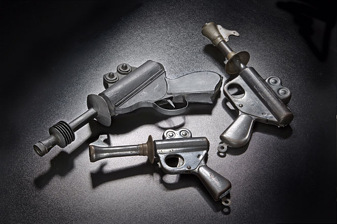 The first 3-D Buck Rogers toy ray gun appeared in 1934. This XZ-31 Rocket Pistol, a 9 ½-inch toy gun that produced a distinctive “pop!” sound, retailed for 50 cents. It was the first of six Buck Rogers toy guns manufactured over the next two decades by Daisy Manufacturing Co.