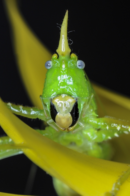 Looking like a character from a classic Saturday Night Live skit, this cone-headed katydid (Copiphora rhinoceros) unsurprisingly gets its name from its pointy-shaped head.