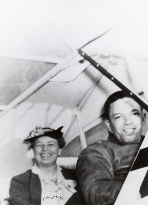 In this 1941 photo, First Lady Eleanor Roosevelt flew with pilot C. Alfred “Chief” Anderson, primary flight instructor at the Tuskegee Institute, during a visit to the flying school. Roosevelt’s willingness to fly with an African American pilot had great symbolic value and brought visibility and support to Tuskegee’s pilot-training program.