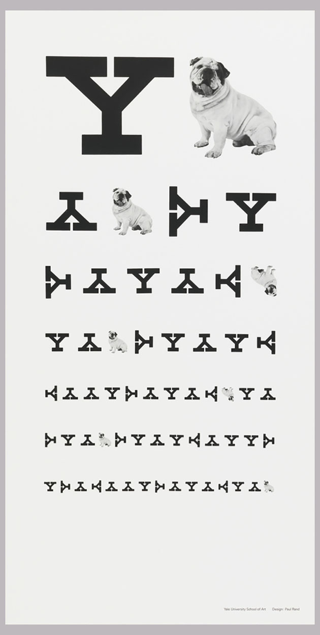 In this poster, graphic designer Paul Rand plays with the iconography of eye charts to create a clever advertisement for Yale University. He incorporates the school’s mascot, an English bulldog, into an eye chart composed exclusively of “Y” letter-forms arranged on various axes.