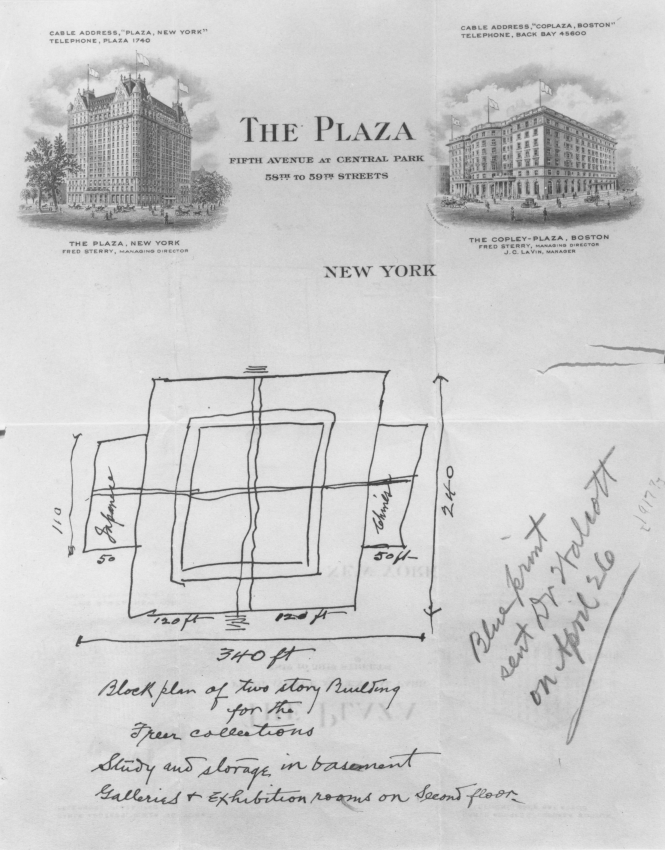 After several years researching museums to determine the best design for his art gallery, Freer decided on a modified version of an Italian renaissance palazzo. In a meeting with architect Charles Platt at the Plaza Hotel in New York City, Freer jotted down his ideas for a classical, well-proportioned building on a piece of hotel stationery. An Italianate structure with a porticoed courtyard would reflect his ideas about art and aesthetics, including scale, proportion, harmony and repose. From the building’s 1923 opening until the 1970s, live peacocks roamed the courtyard, creating, in effect, a living peacock room to rival the museum’s painted masterpiece, “The Peacock Room,” by James McNeill Whistler.
