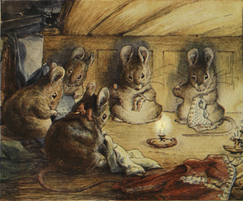 This cozy, warm scene of mice busily sewing is from the book The Tailor of Gloucester by Beatrix Potter.