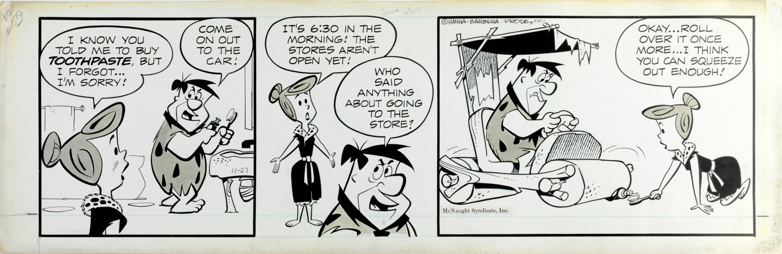 This pen-and-ink drawing prepared for "The Flintstones" comic strip shows Fred Flintstone using his vehicle to squeeze out the last bit of toothpaste in the tube.