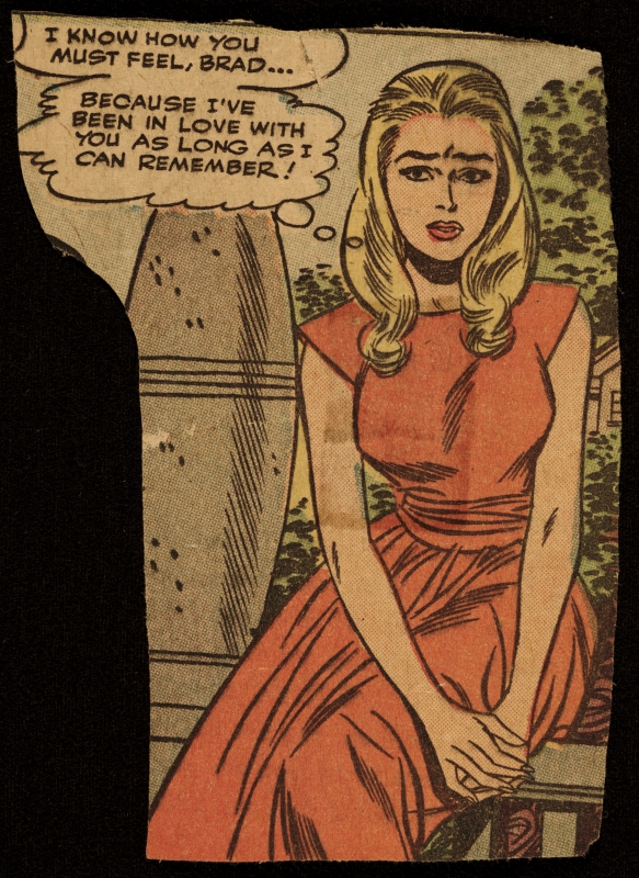 This document is in the “Finding: Source Material” exhibition from the Smithsonian’s Archives of American Art. Artist Roy Lichtenstein (1923–1997) included it in a letter he wrote in April 1963 to curator Ellen H. Johnson. In the letter, Lichtenstein informed Johnson of his completion of two paintings she had seen on a visit to his studio: “I Know How You Must Feel, Brad…” and “Girl at the Piano” and he included the original source material—two clippings from newspaper comics.