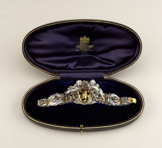 This intricate bracelet, dated to mid-19th century France, depicts two cherubs (or Cupids) supporting a heart cartouche. Likely presented as a gift to a loved one, it is an early example of aluminum jewelry, which was a rare and expensive metal at the time. Bracelets like this one were produced as luxury items due to the intensive labor and craftsmanship required to combine the aluminum with other expensive materials, such as gold and gems.