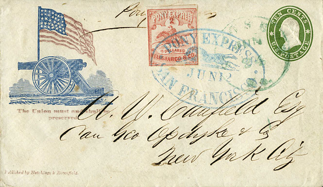 In June 1861, this envelope was carried from San Francisco to A.W. Canfield in New York City. It took 12 days to reach its destination. It features full markings, stamp and a patriotic cachet from the Pony Express mail route. This tells the important story of postal history during the late 1800s. It was collected by the Smithsonian in 1971.