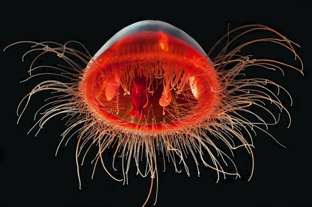 Red light doesn’t penetrate into the deep ocean, so animals with red pigmentation have no visible light to reflect and are nicely camouflaged. The blood-red guts of this jellyfish, Voragonema pedunculata, may use this camouflage technique to block out the light produced by the bioluminescent prey it accumulates in its stomach while scavenging the deep. That way it doesn’t get easily marked as prey itself.