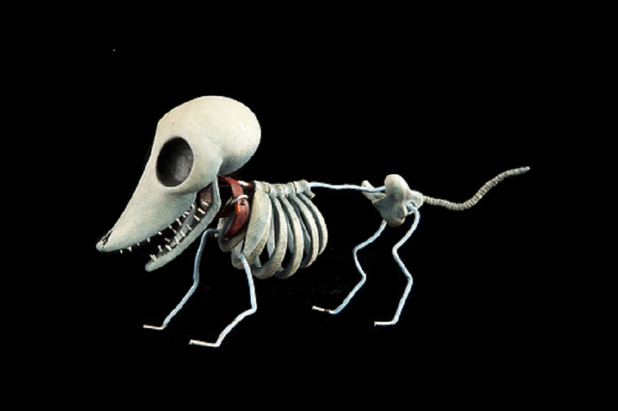 This skeletal pup wearing a red-leather collar is "Scraps," one of the 300 puppets created for 30 characters in the 2005 stop-motion animated film Corpse Bride, directed by Tim Burton and Mike Johnson.