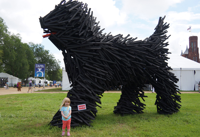 As part of the 2013 Smithsonian Folklife Festival Program “Hungarian Heritage: Roots to Revival,” artist Gábor Miklós Szőke created a sculpture of a Puli dog using narrow cuts of lumber painted black. Puli dogs are a 1,000-year-old, medium-sized breed of Hungarian herding dog that are known for their long, curly coats, which are almost waterproof.