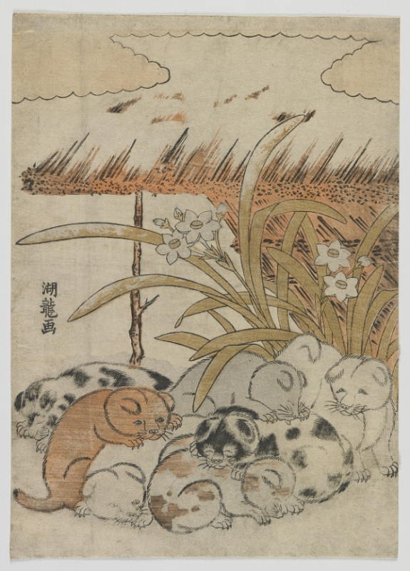 In one of his most charming designs, Japanese artist Isoda Koryūsai (1735–1790) depicted seven puppies huddled together under a shelter that protects a blossoming narcissus from the snow. The woodblock print, from the Smithsonian’s National Museum of Asian Art, also incorporates references to 1778, the year in which the print was published. Each year in the cycle of 12 years was associated with an animal of the zodiac; 1778 was the Year of the Dog, as was the seventh year of the An'ei era (1772–81), which is represented by the seven puppies.