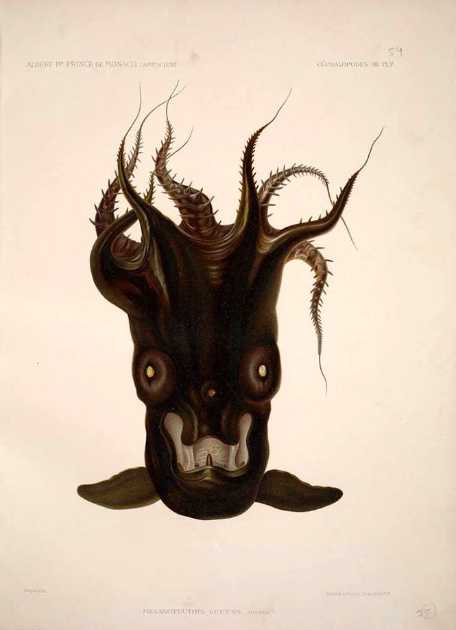 In 1889, Prince Albert I of Monaco began writing the series Résultats des campagnes scientifiques accomplies sur son yacht. The series, including the volume with this vampire squid illustration, is held for research at the Smithsonian Institution Libraries.