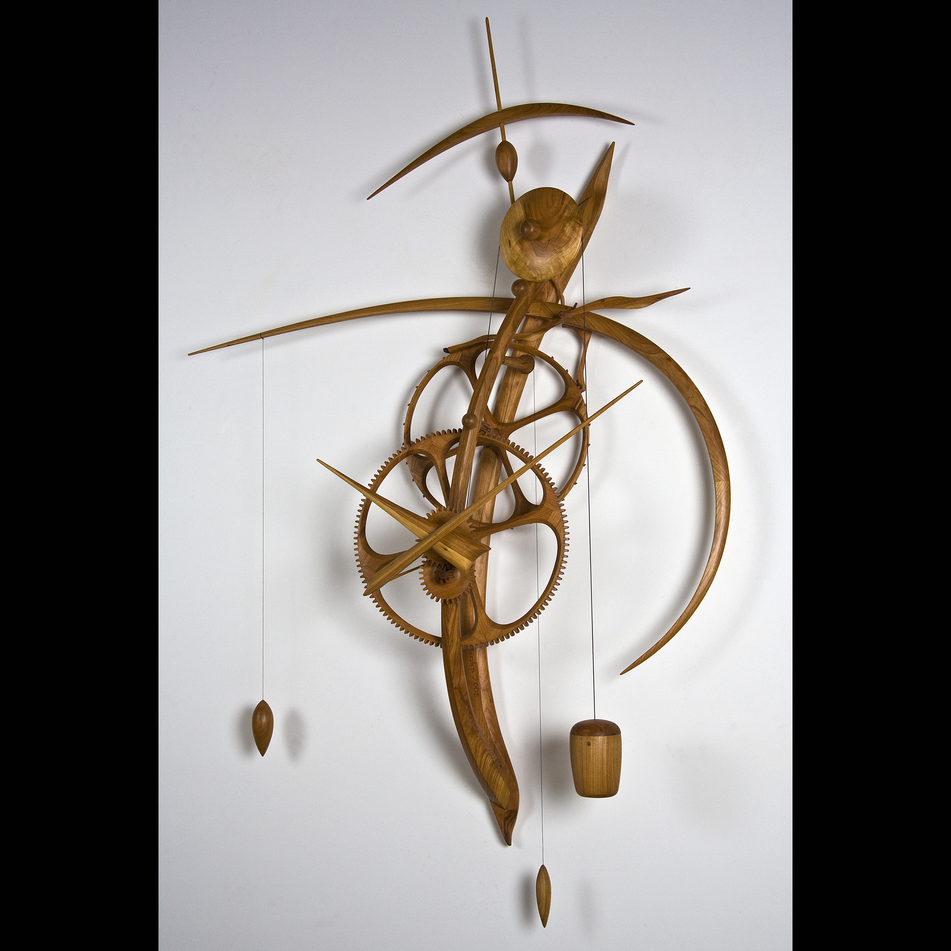 Wall clock in cherry. The clock is five feet high and three feet wide. Long arc with upward extension is the rocking pendulum with three-second motion.