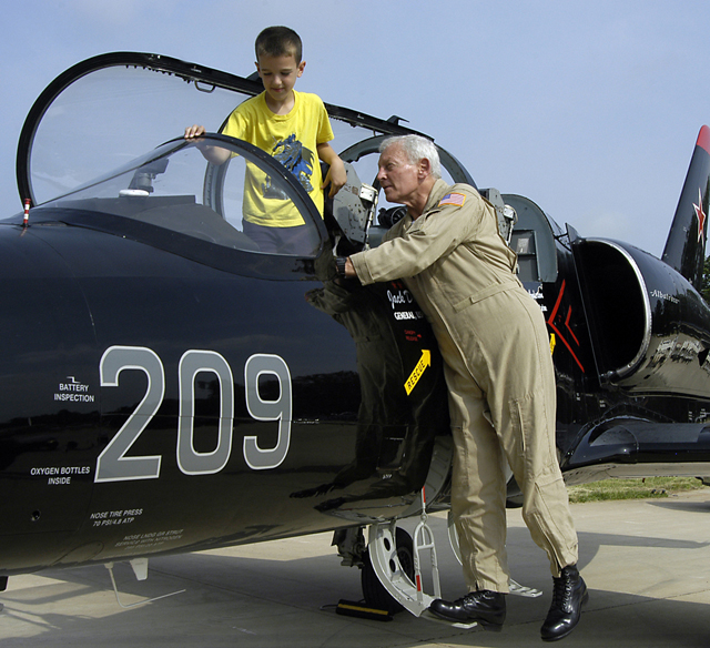 Director of the National Air and Space Museum Gen. John R. "Jack" Dailey shows a youngster the inner workings of a jet fighter at the Annual Become a Pilot and Aviation Display Family Day.