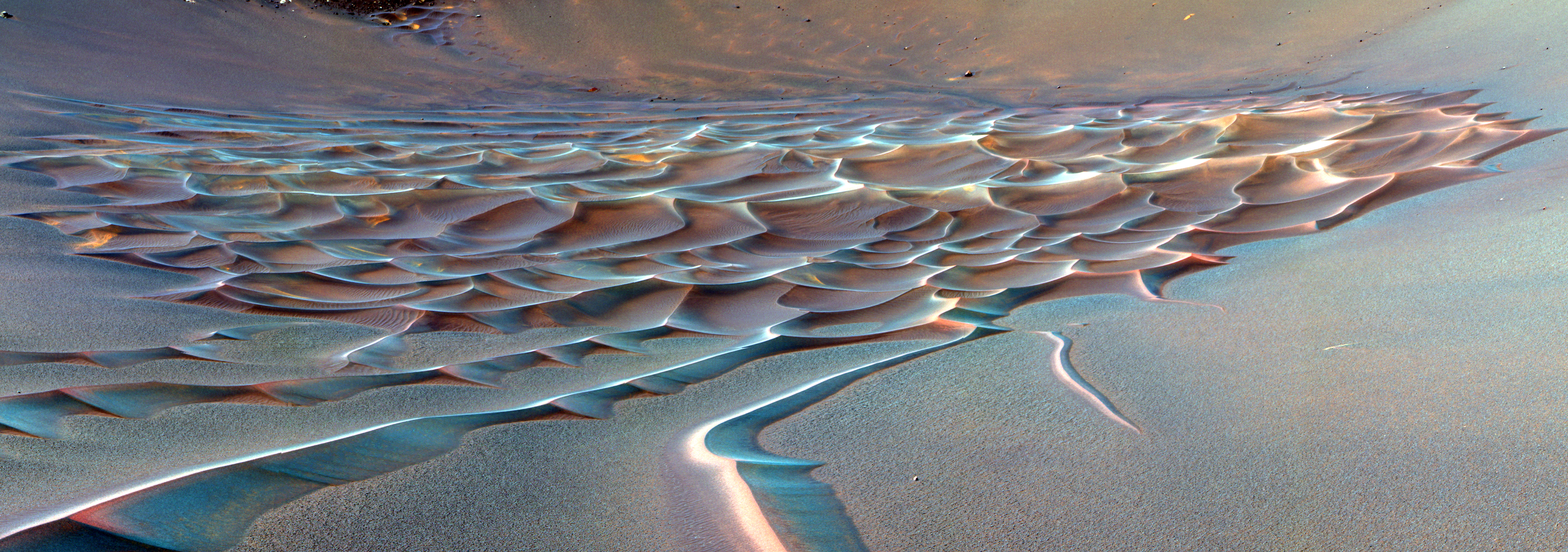 Ralph Bagnold, an early pioneer of dune studies, remarked that—compared to the nearly static chaos that seems to characterize slowly crumbling, weathering landscapes—sand dunes can “move inexorably, in regular formation, over the surface of the country, growing, retaining their shape, even breeding, in a manner which by its grotesque imitation of life, is vaguely disturbing to an imaginative mind.” Perhaps more so, if we’re on Mars?