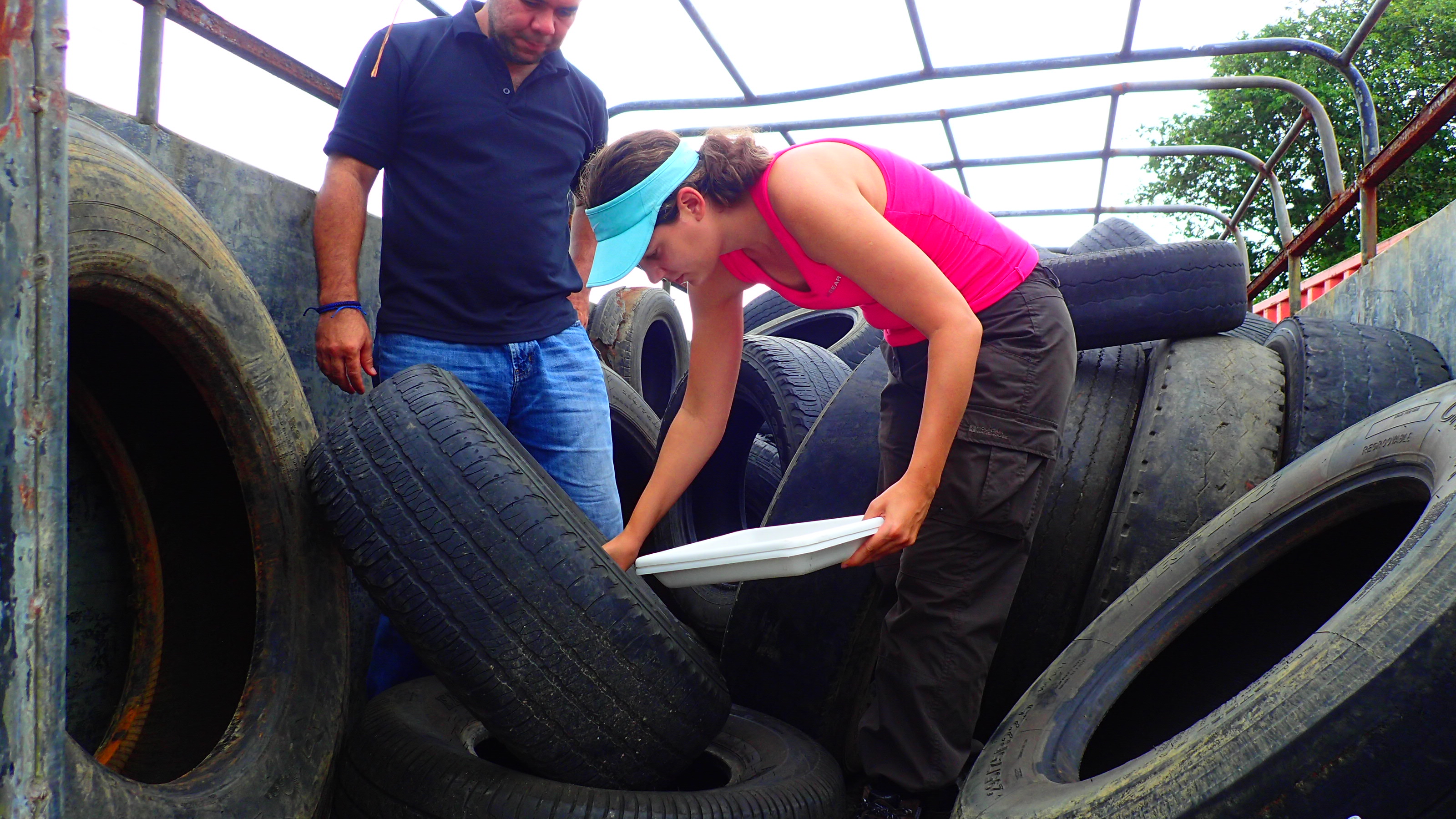 Kelly Bennett, post-doctoral fellow, and Jose Loaiza, principal investigator, sample mosquito larvae from used tires.
