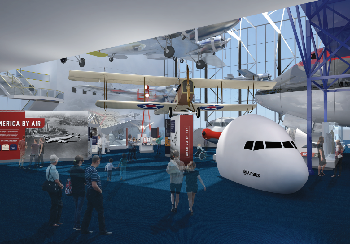 America by Air explores the history of air transportation in America and the ways that improvements in technology have revolutionized air travel. This rendering shows a revamped approach to the museum’s commercial aviation gallery.