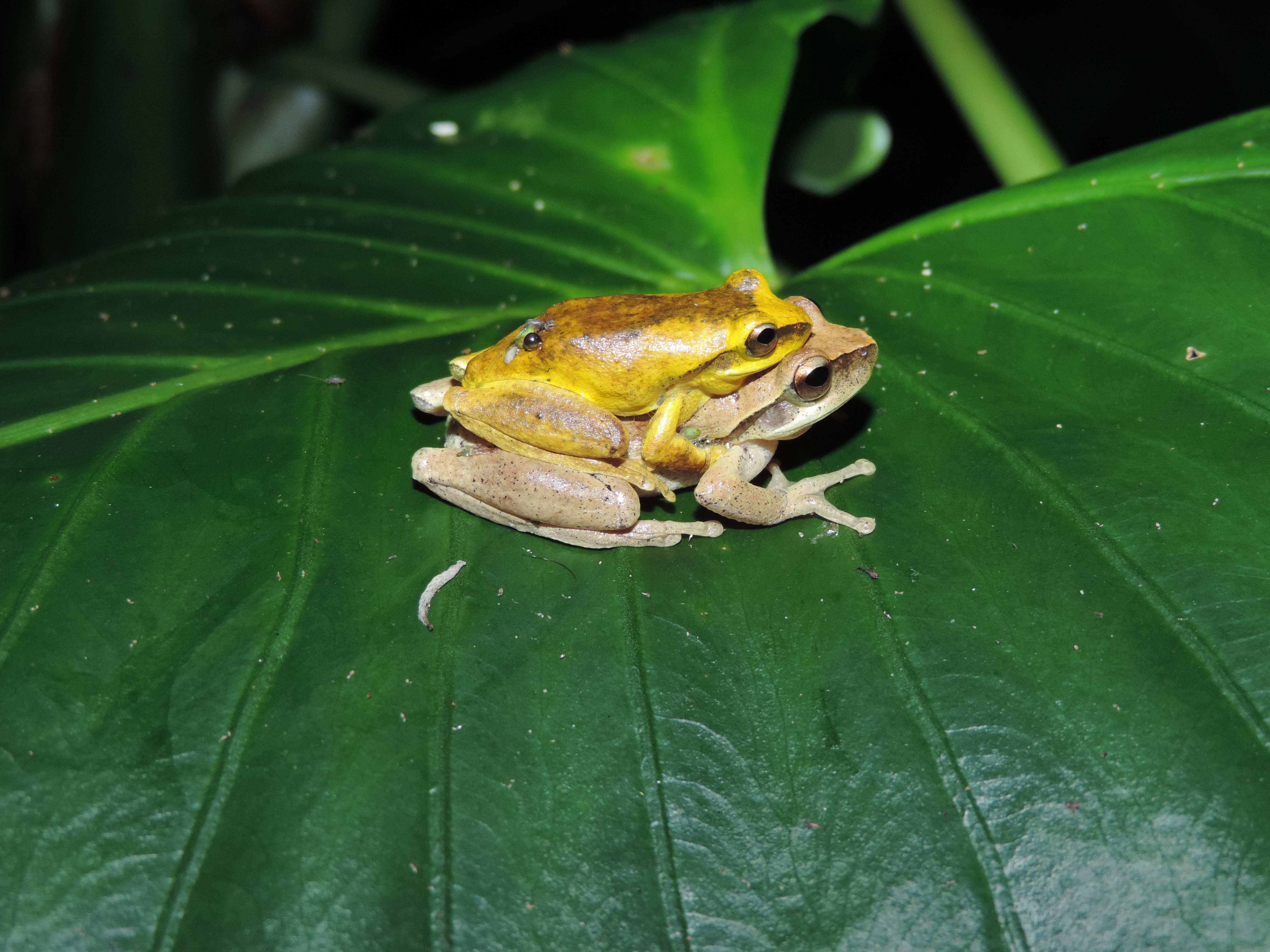 Mating whirring tree frogs (Litoria revelata) with the male (yellow) in display coloration. The baseline color of the whirring tree frog is mostly brown, but during the breeding season, males have dynamic color change and are able to change to a conspicuous yellow.