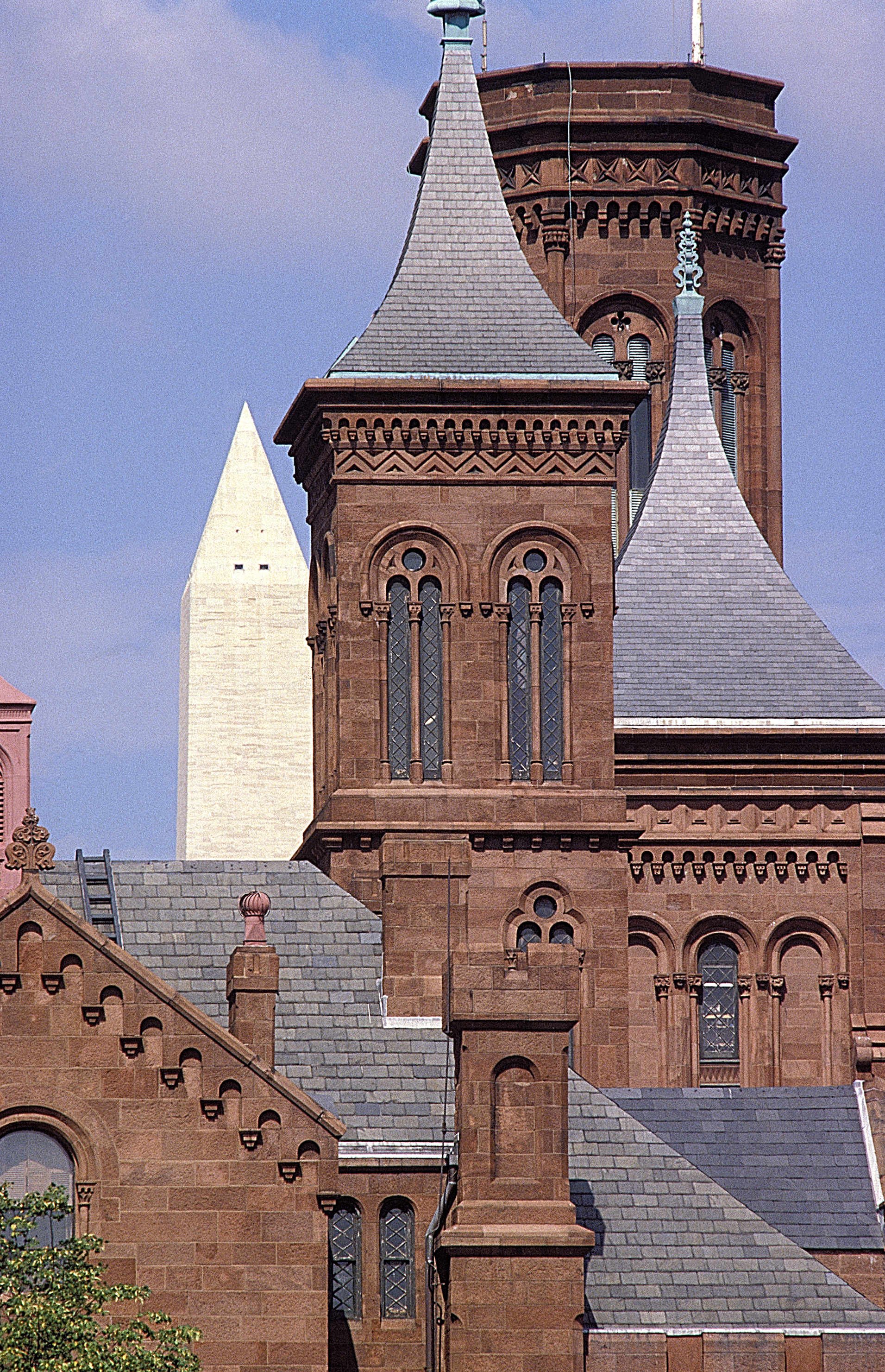 West-facing view of the east spires and roof of the Smithsonian Institution Building ("The Castle") in Washington, D.C., with the Washington Monument in the background.