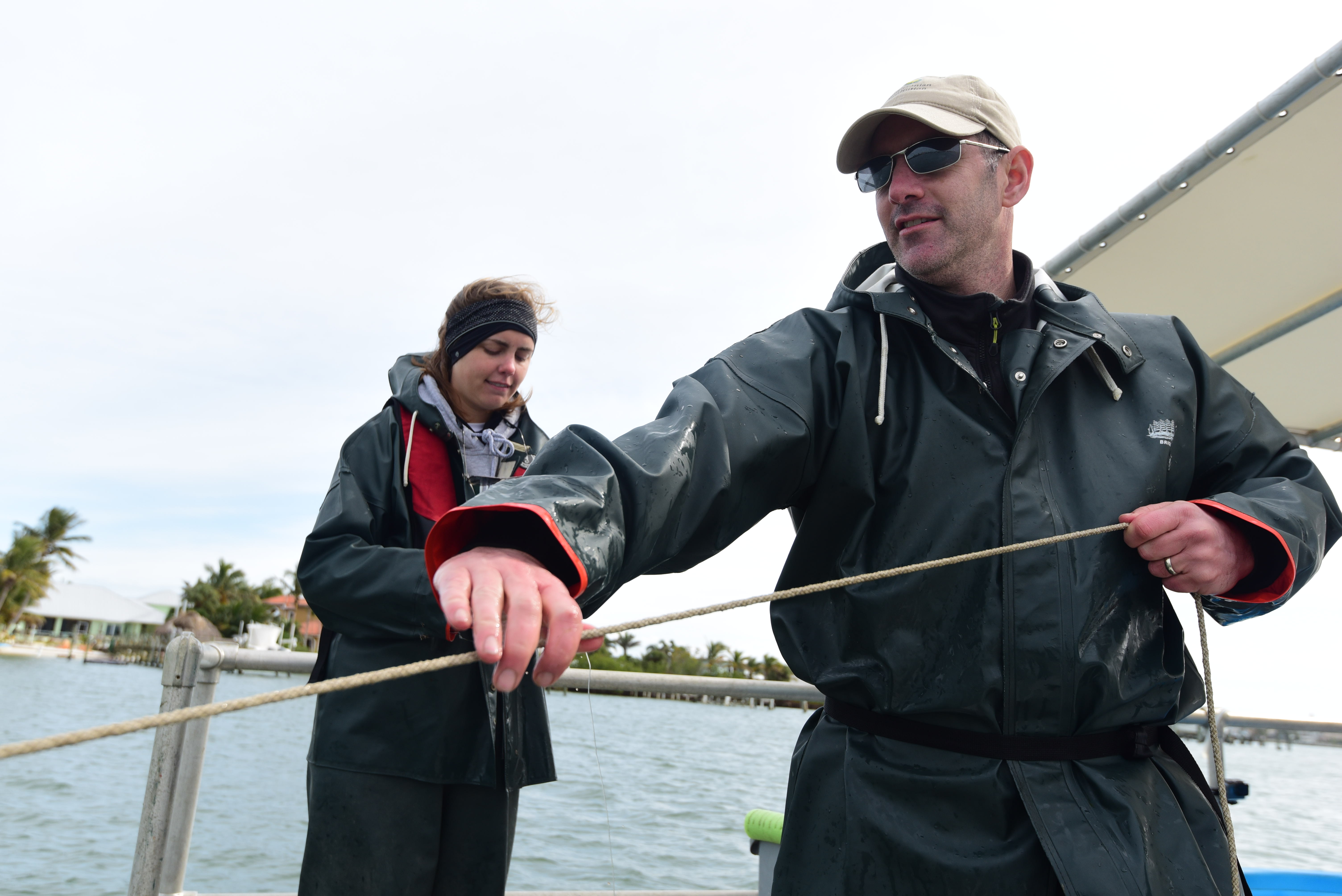 SERC marine ecologist Matt Ogburn (front) and intern Claire Mueller search for bull sharks and cownose rays near Fort Pierce, Florida, in January 2018.