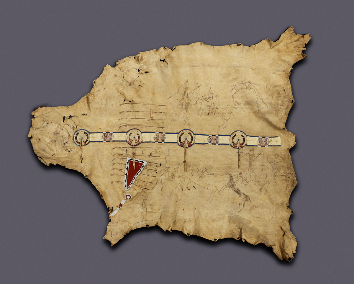Buffalo hide, pigment, red wool trade cloth, beads, porcupine quill, horse hair