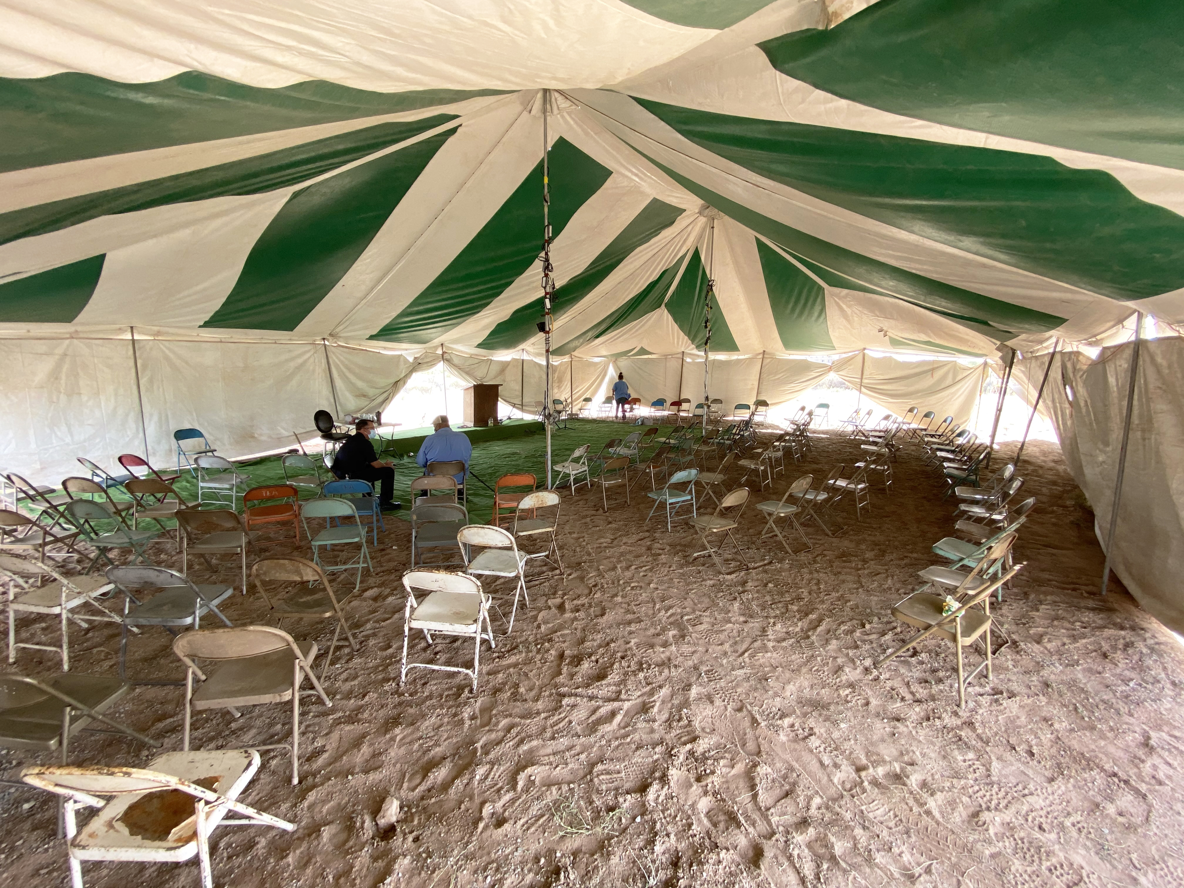 Gallup Fire Marshal Jesus Morales (left) speaks to a pastor who pitched a tent to hold a church revival in Gallup, New Mexico. Many Diné visit and live in the area. Morales informed the pastor of New Mexico’s public health order prohibiting mass gatherings. Acknowledging the health risk, the pastor agreed to conduct services outside the tent with people remaining in their vehicles. Religious gatherings have been considered inherently risky during the pandemic. The Navajo tribe’s COVID-19 outbreak has been traced to a church gathering in Chilchinbeto, Arizona, on March 7, 2020. Chilchinbeto is located 136 miles northwest of Gallup.