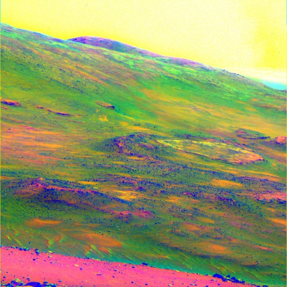 Spirit obtained this view of the area called Home Plate while parked atop Husband Hill. The colors emphasize differences in rock weathering. A large dust devil appears as the V-shaped discoloration of sky at the top right.