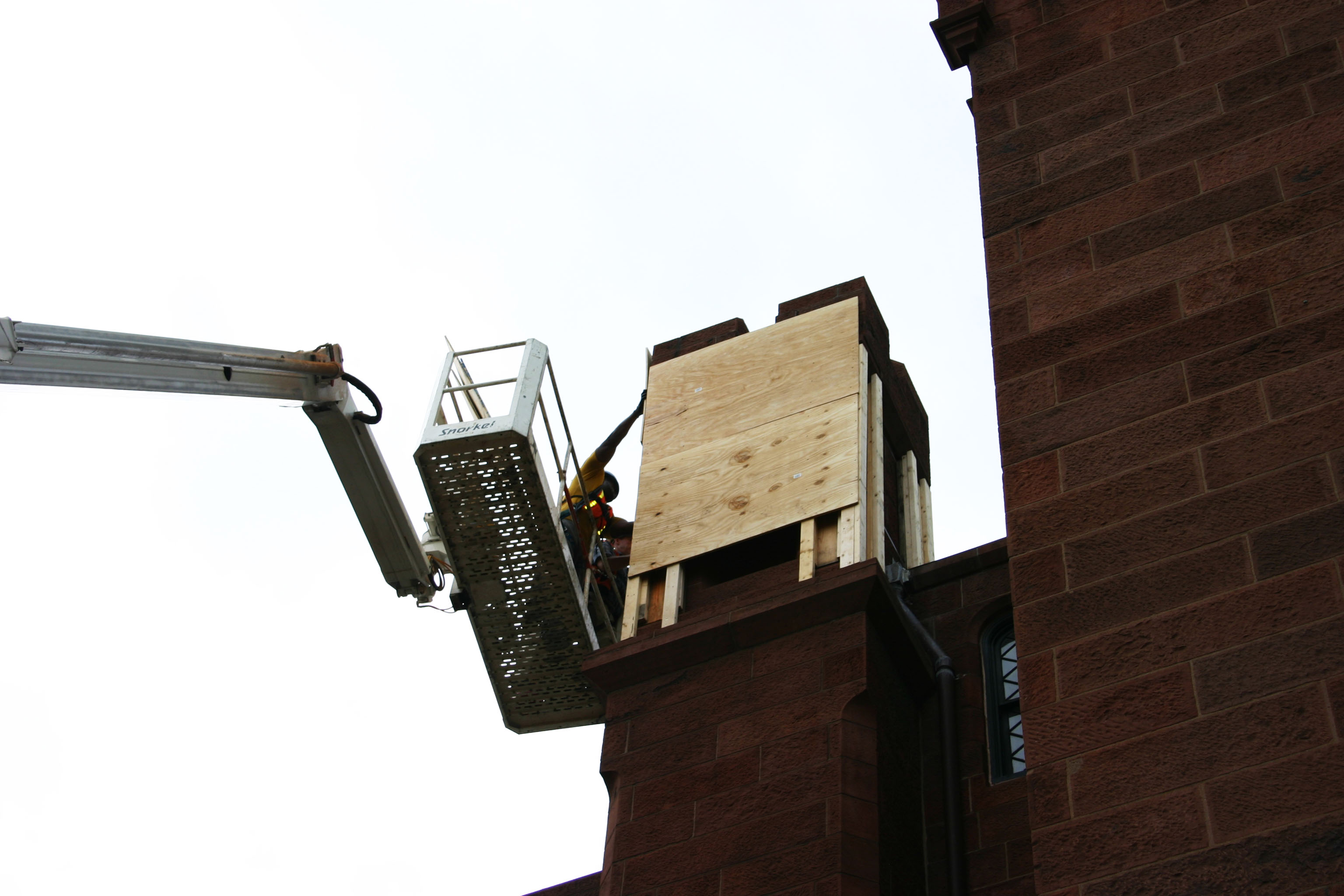 The Smithsonian Institution Building ("The Castle") in Washington, D.C., sustained localized damage in the east wing during the Aug. 23, 2011 Virginia earthquake. Six chimneys and decorative turrets on the roof were damaged when some of the mortar holding the stones was shaken loose during the earthquake and some stones shifted in place. Crews worked to secure the structures with plywood and metal and nylon bands so they would not sustain further damage from anticipated Hurricane Irene in the days following the earthquake.
