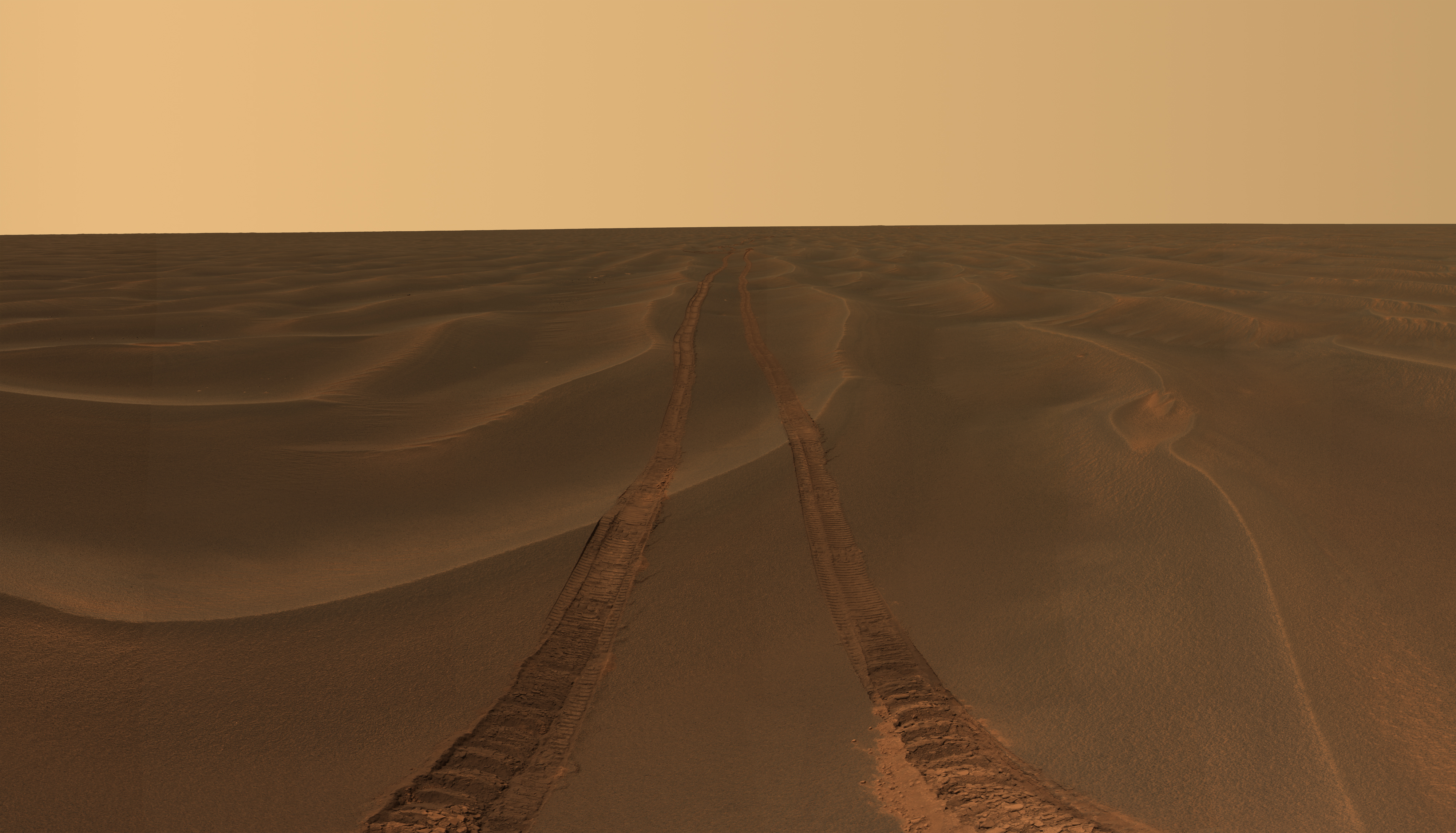 Rover tracks disappear toward the horizon like the wake of a ship across the desolate sea of sand between the craters Endurance and Victoria on the Meridiani Plains. Opportunity took the image while stuck in the sand ripple dubbed Purgatory for over a month. This panorama (only partly shown here) was named Rub Al Khali after the “Empty Quarter” in the Arabian Desert.