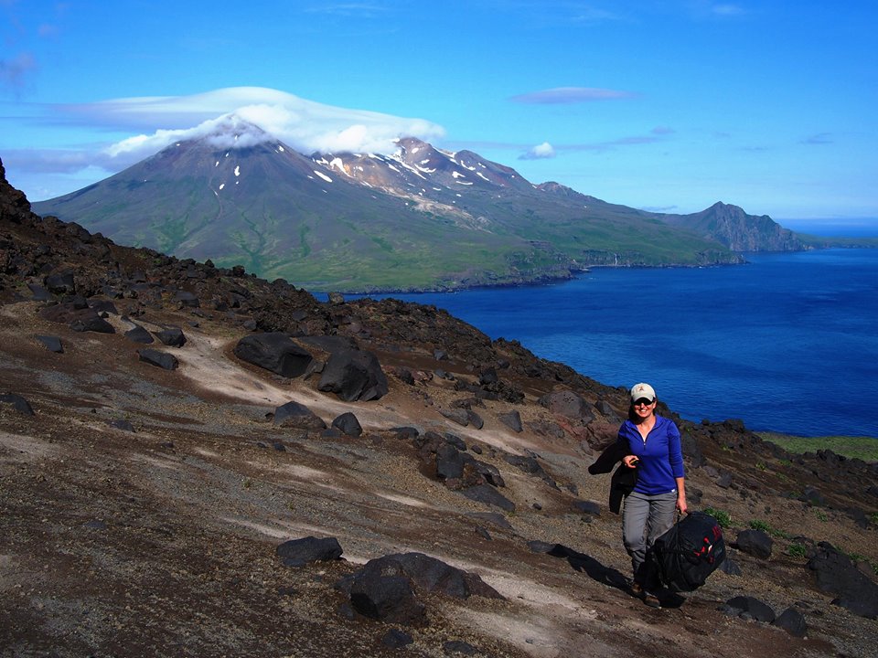 Geophysicist Diana Roman of the Carnegie Institution for Science on the flank of Cleveland Volcano in 2016. Tana Volcano, composed of several peaks in this image, is in the background. Tana Volcano is less active than some of the other studied volcanoes, which is part of the reason it does not have the standard conical shape commonly seen at highly active volcanoes such as Shishaldin and Cleveland. Roman was dropped off near this location by helicopter, carrying emergency supplies that included everything necessary to survive for a few days in the Aleutians. These supplies are necessary to have in the field because the weather can change quickly, and if this occurs, the helicopter may not be able to safely land to retrieve field teams; however, the pilot was able to successfully retrieve all members of the team without incident during the team’s expeditions.