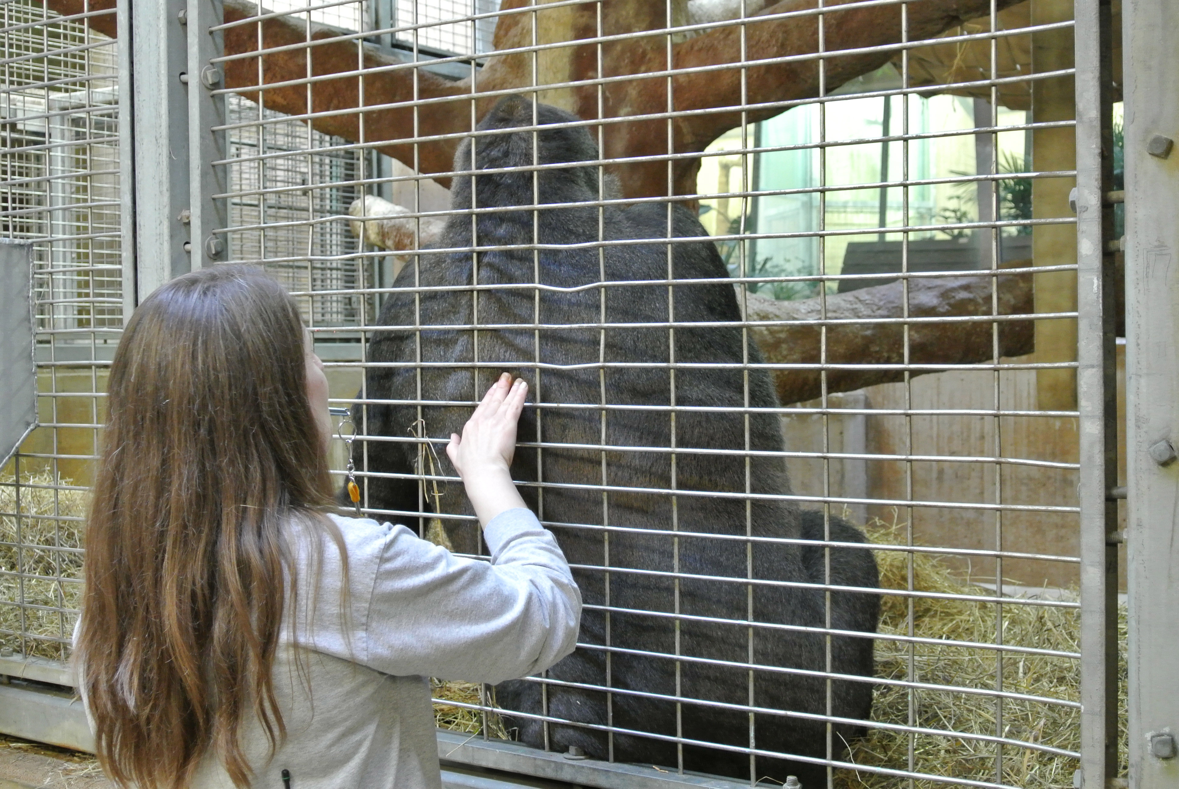 Gorilla keeper Becky Malinksy trains Kwame to present different parts of his body, specifically his back, so that she can download data from the Implantable Loop Recorder.