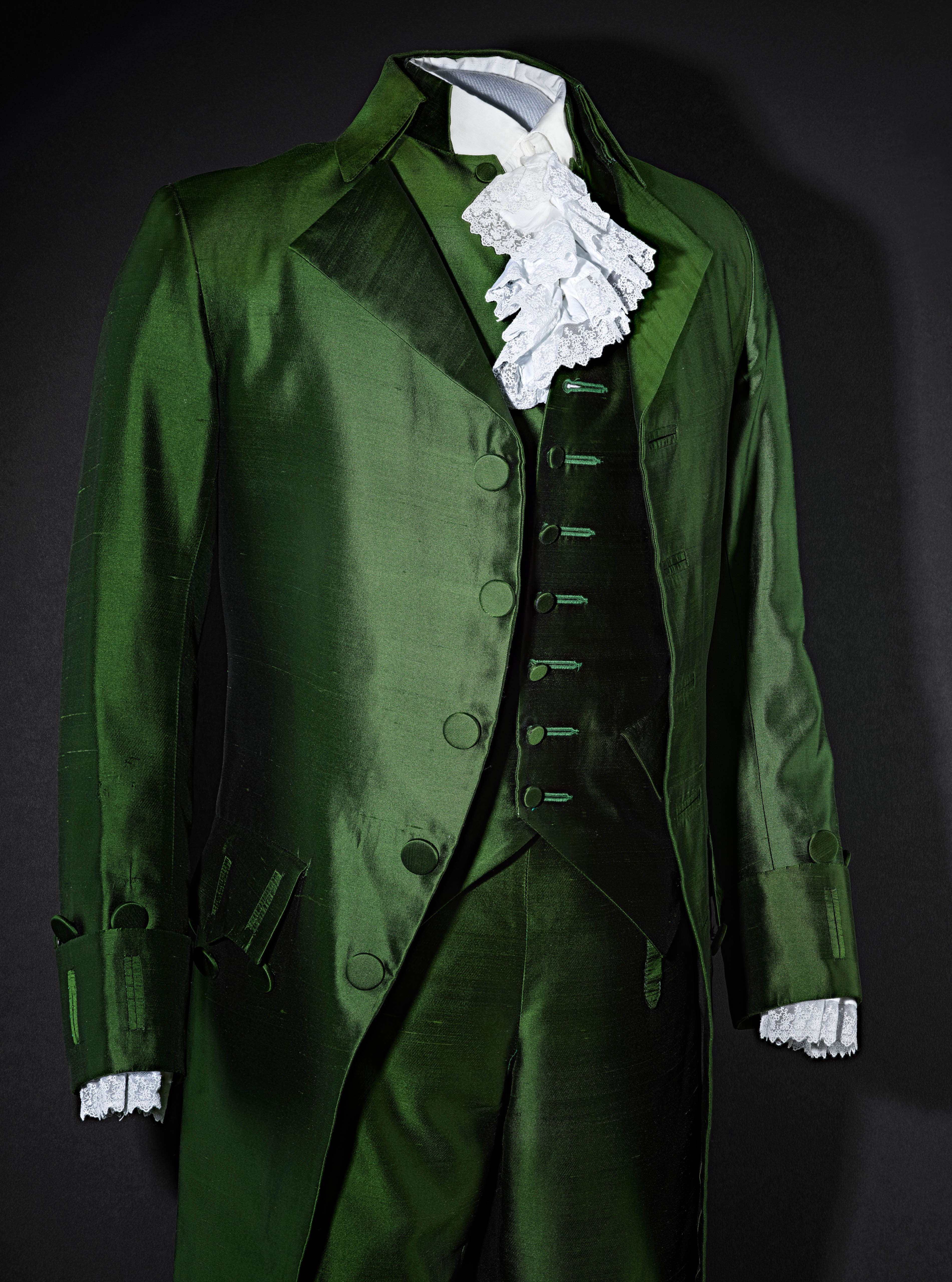Detail of the green suit worn by Lin-Manuel Miranda as Alexander Hamilton in Hamiton: An American Musical, designed by Paul Tazewell. Suit consists of breeches, waistcoat, coat, white shirt with ruffled collar and sleeve cuffs.