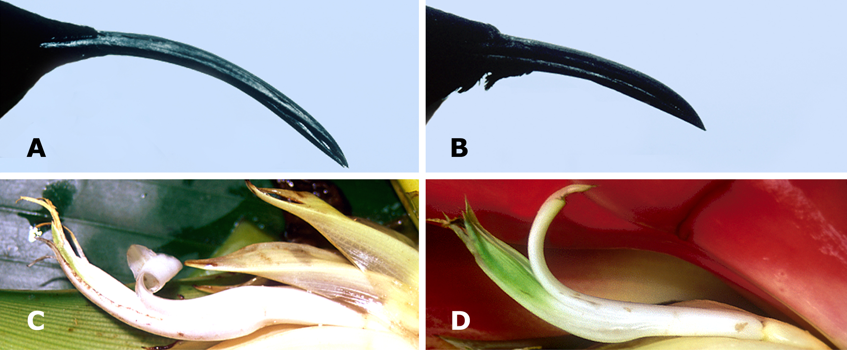 A diagram showing the complementary morphology of female (A) and male (B) purple-throated carib hummingbirds, and the flowers they pollinate, H. bihai (C) and H. caribaea (D). This example of bird sex-to-flower species co-evolution is rarely observed in nature, but clearly demonstrates a highly specialized inter-species relationship that developed over the course of millions of years.