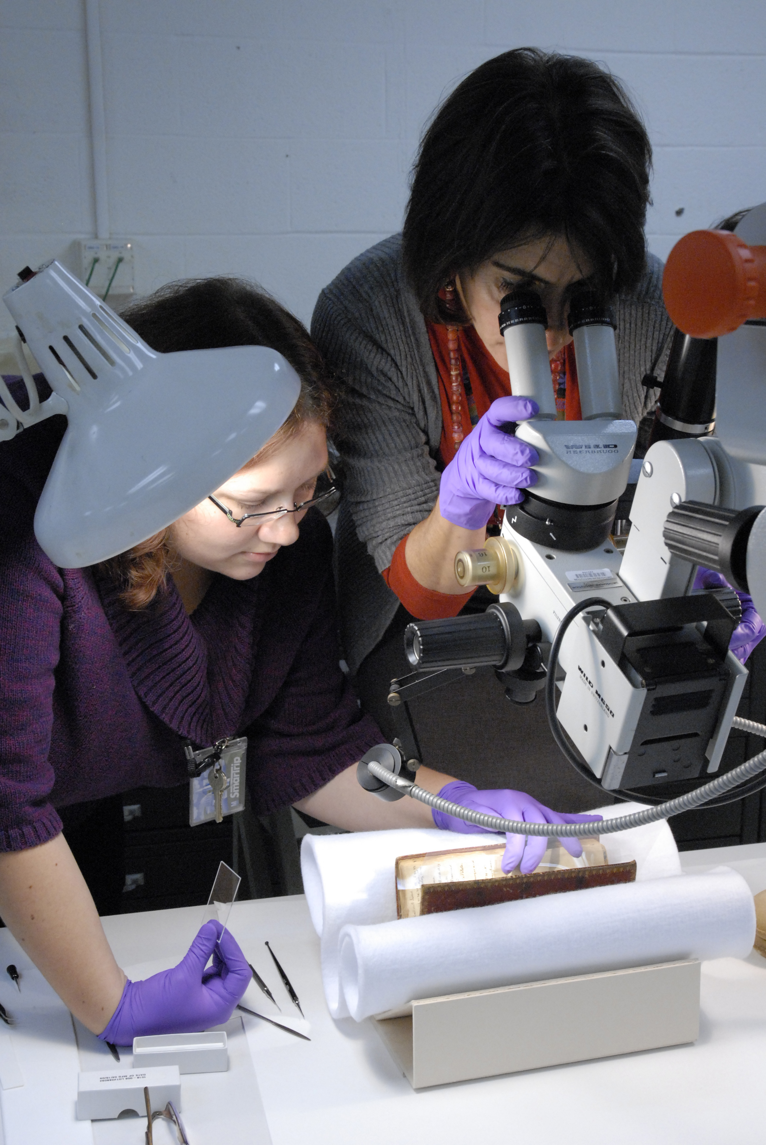 Emily Rainwater, post-graduate fellow, and Janice Stagnitto Ellis, senior paper conservator at the Smithsonian’s National Museum of American History's Paper Conservation Lab, work carefully to conserve the construction and aesthetics of the Thomas Jefferson’s private text, The Life and Morals of Jesus of Nazareth—colloquially known as the Jefferson Bible. It will be on display in the museum’s Albert Small Documents Gallery from November 11, 2011 – May 28, 2012.