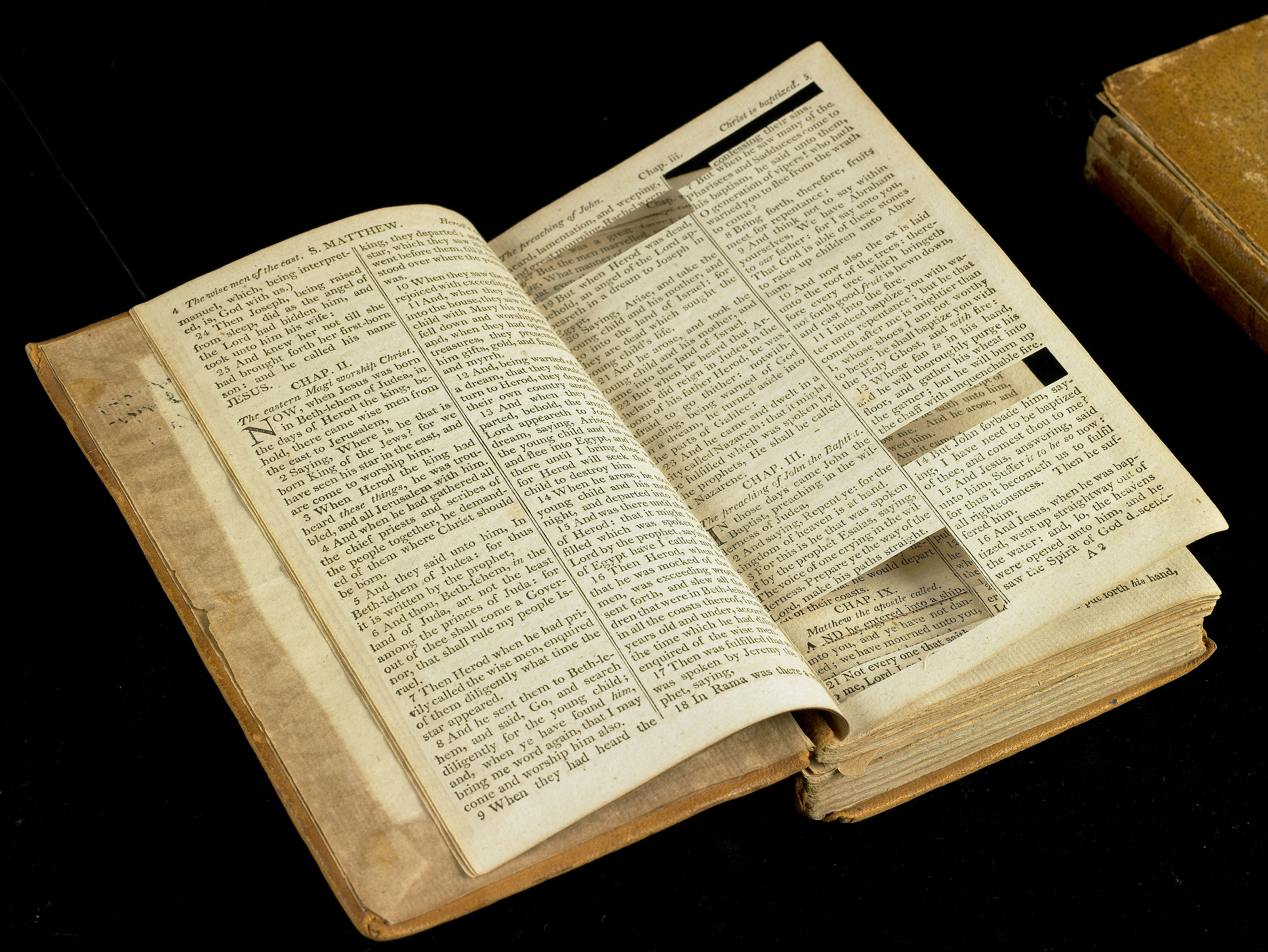 A source Bible from which Thomas Jefferson’s private text, The Life and Morals of Jesus of Nazareth—colloquially known as the Jefferson Bible—was culled in part. Jefferson pulled from the Four Gospels of the New Testament in Greek, Latin, French and English and the text has been meticulously conserved at the Smithsonian’s National Museum of American History. It will be on display in the museum’s Albert Small Documents Gallery from November 11, 2011 – May 28, 2012.