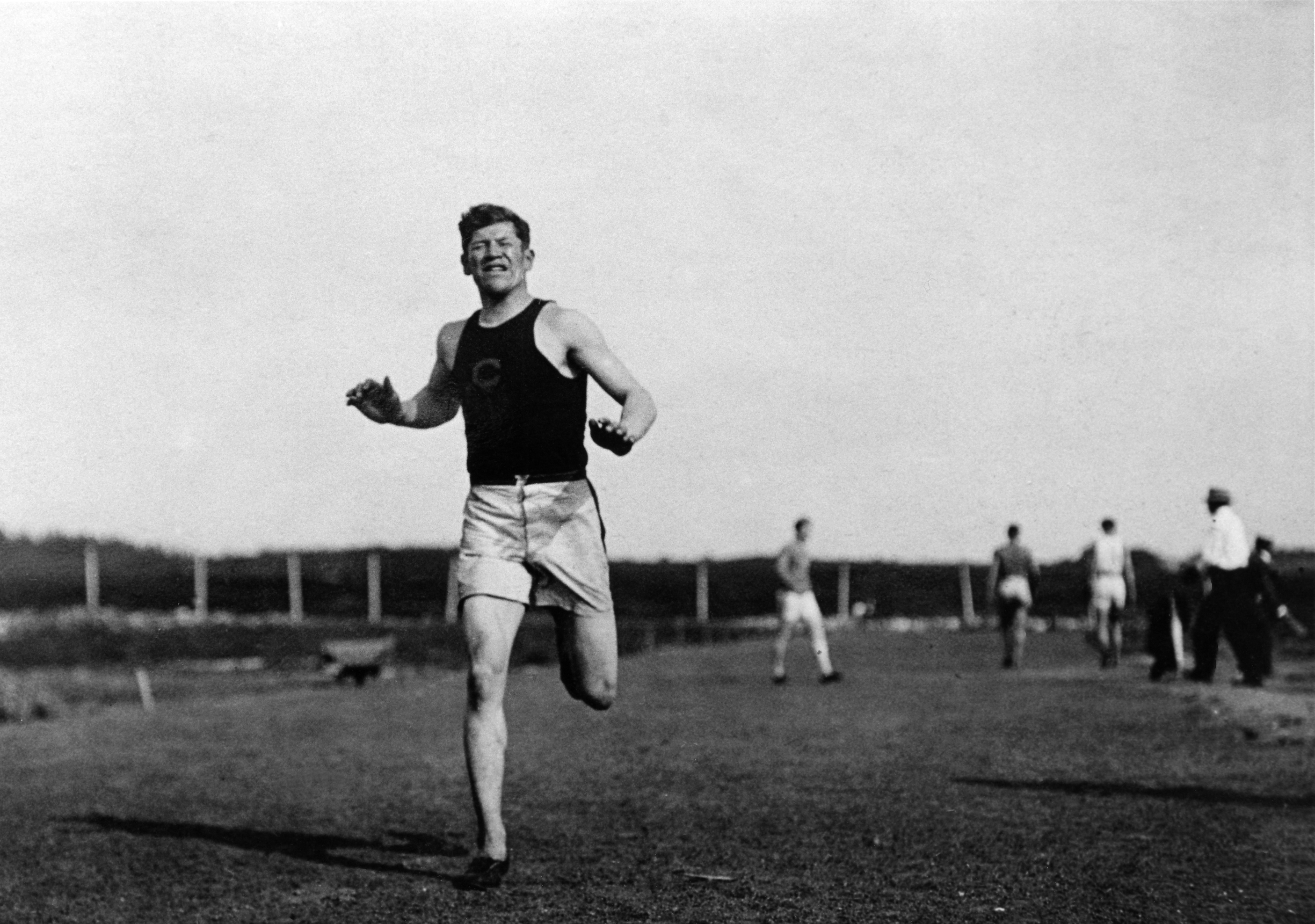 Jim Thorpe (Sac and Fox) in Carlisle Indian School track uniform, running at Stockholm in Olympic track practice.