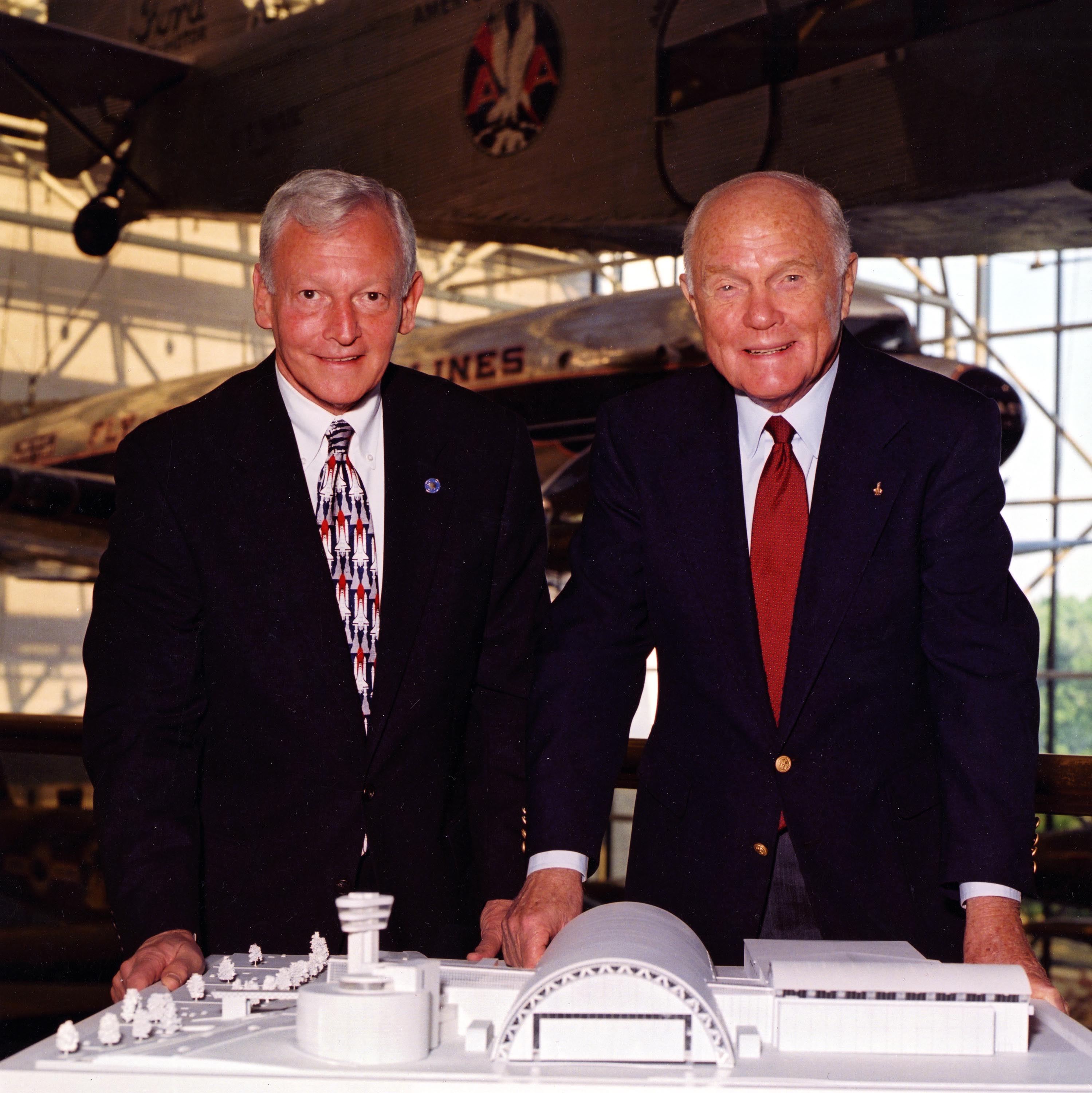 John Revell "Jack" Dailey (left) and John Herschel Glenn, Jr. pose with a model of the National Air and Space Museum's Steven F. Udvar-Hazy Center, 2000. They are standing on the second floor of the National Air and Space Museum's National Mall building, overlooking the "Air Transportation" gallery. Glenn was the honorary Chairman of the Fundraising Committee.