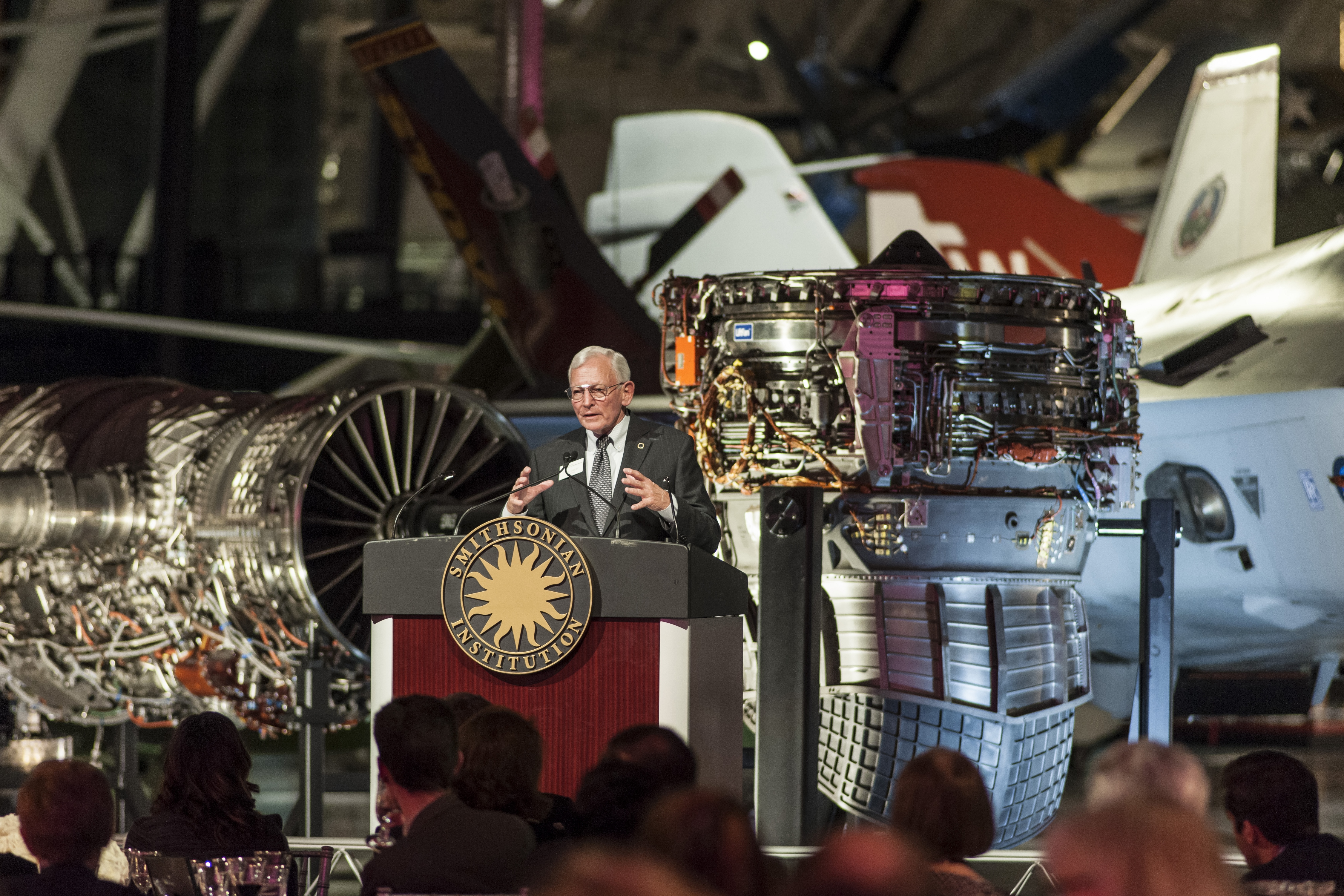 Celebration of the Tenth Anniversary of the opening of the Smithsonian National Air and Space Museum's Steven F. Udvar-Hazy Center, November 21, 2013. Museum Director Gen. John R. "Jack" Dailey speaks to guests in the Boeing Aviation Hangar.