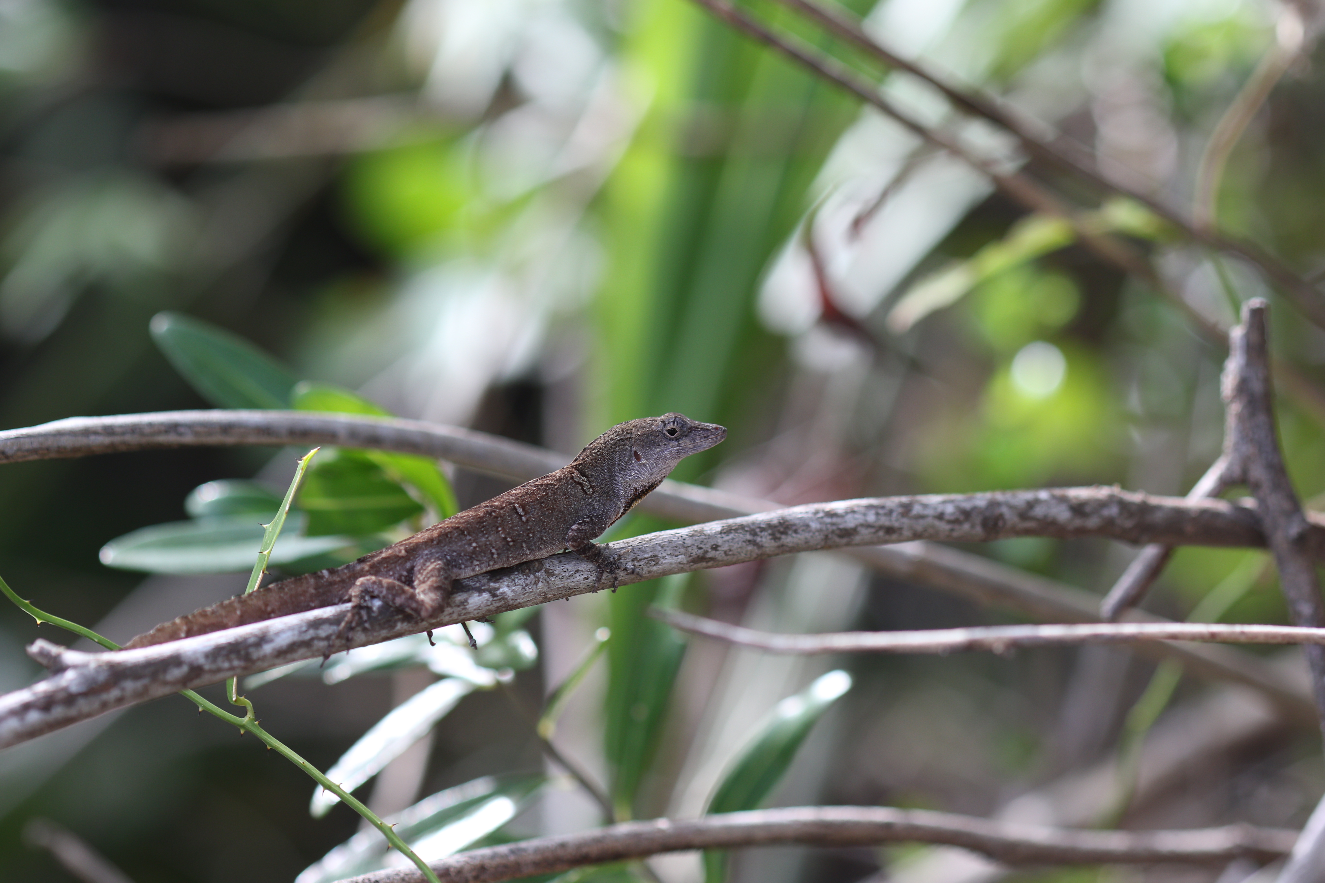 A Bahamian anole lizard (Anolis sagrei) perches in its native terrain in the Bahamas. (Photo by Michael Logan)