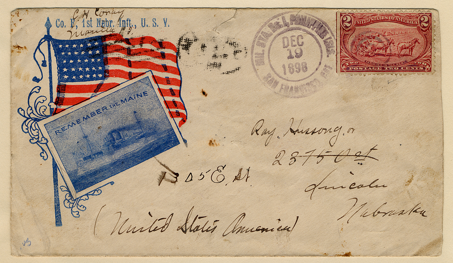 This message sent home to Nebraska from the Philippine Islands in 1898 carried the rallying cry “Remember the Maine,” evoking one of the precipitating events of the Spanish American War.