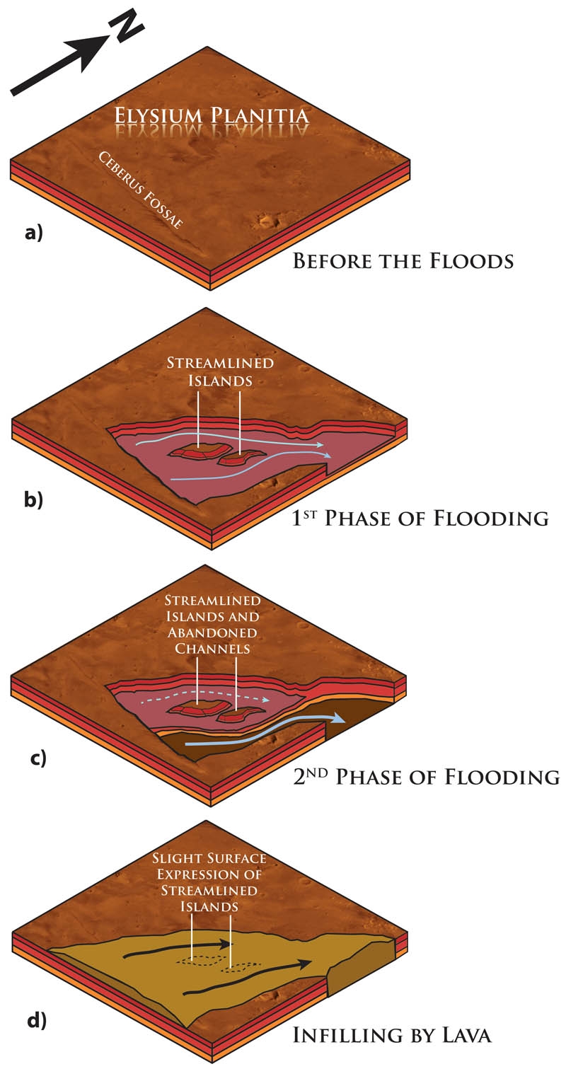 Our interpretation of the geologic history of Eastern Elysium Planitia. (a) Before the formation of Marte Vallis, the Cerberus Fossae fracture system cuts across the volcanic plains of Elysium Planitia. We see three seperate geologic layers betheath the surfase of the plains. (b) Floods erupt form Cerberus Fossea, the first phase of erosion carves channels around streamlined islands. (c) During the second phase, flow is concentrated in a single channel that is eroded below the level of the other channels. (d) After the floods, volcanic eruptions cover the surface of eastern Elysium Planitia with lava, which bury a portion of Cerberus Fossae and infill the Marte Vallis channels. With SHARAD, we have mapped out the subsurface boundaries between the three geologic layers. From identifying where there are incisions through one or two of these boundaries, we were able to map out the shape and scale of the channels. The surface was generated from modifying the NASA Viking Merged Color Mosaic data set