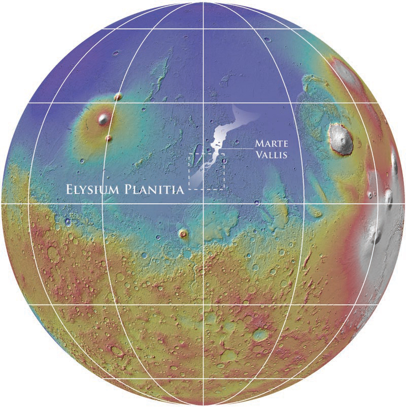 The location of the ~ 1000 km Marte Vallis channel system on Mars. Marte Vallis is filled with young lavas obscuring the source and morphology of the channels. The dashed box highlights the area shown in Fig. 2. The background shows the global topography of Mars (MOLA colorized elevation above a MOLA hillshade image).