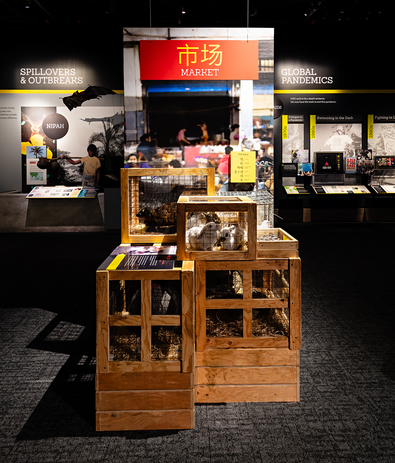 Animal health is linked to human health. Most viruses that infect humans are zoonotic—they originated in other animals. Influenza, Ebola, Zika, HIV and SARS are just a few of the over 800 known zoonotic viruses that cause human diseases. From industrial farms to live-animal markets, animals kept in crowded environments can easily spread influenza and other viruses. A crowded market scene featuring taxidermy specimens and models of wild animals provides a look at how spillover opportunities increase in scale and scope in an urban setting. In some countries, animals of different species are caged stacked or close together in live markets. Many of these animals never ordinarily meet in the wild. This creates opportunities for viruses to jump from one species to another. This market scene is on display in the new exhibition, “Outbreak: Epidemics in a Connected World,” at the Smithsonian’s National Museum of Natural History through 2021.