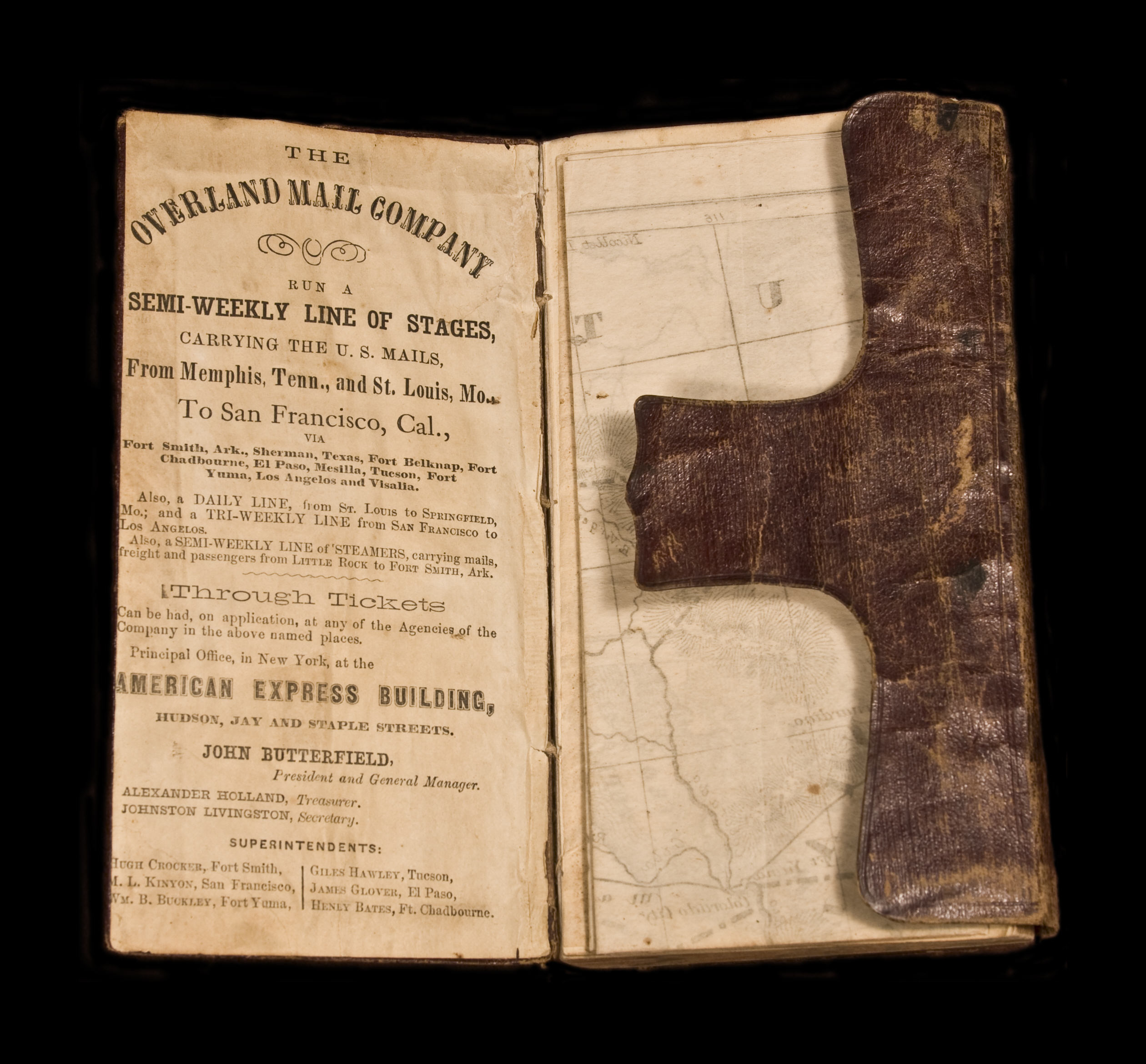 A leather flap clasps this notebook printed by Hellier and Company Publishers, New York. Issued by the Overland Mail Company to conductors, agents, drivers, and station managers working on the express stagecoach route, the notebook was designed for recordkeeping. Its accordion pocket and multiple sections hold a fold-out map of the mail route; instructions for employees of the Overland Mail Company; schedules for the stagecoach; rates of postage; and spaces to record a daily log for the calendar year 1859 and to track accounts.