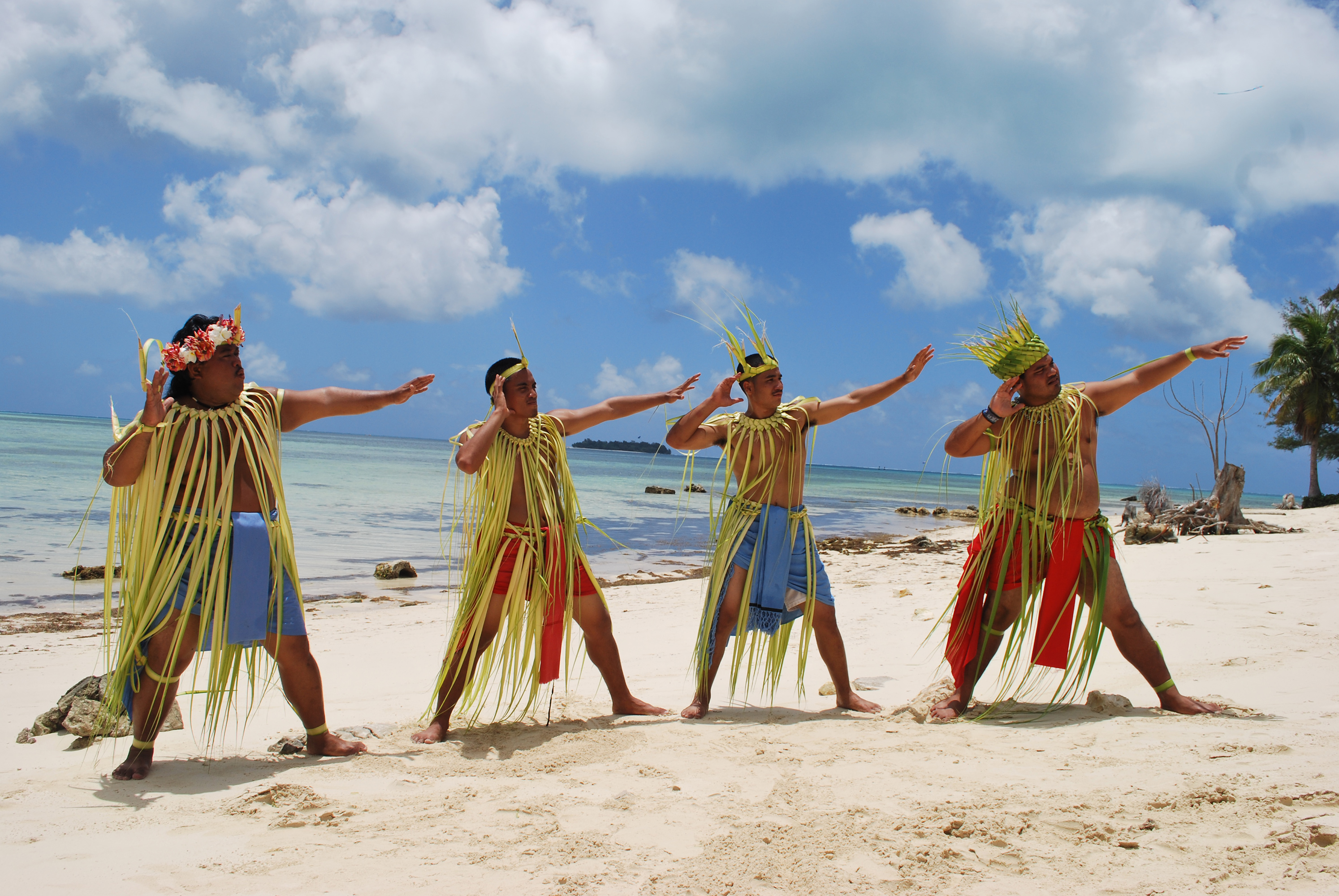 Left to right: Palúw dancers Glenn Ruben, Ricardo Marciano, David Hosono II, and Frankie W. Limes, who will perform daily during the Living Earth Festival at the Smithsonian's National Museum of the American Indian in Washington, D.C., July 20-22.