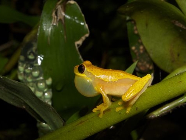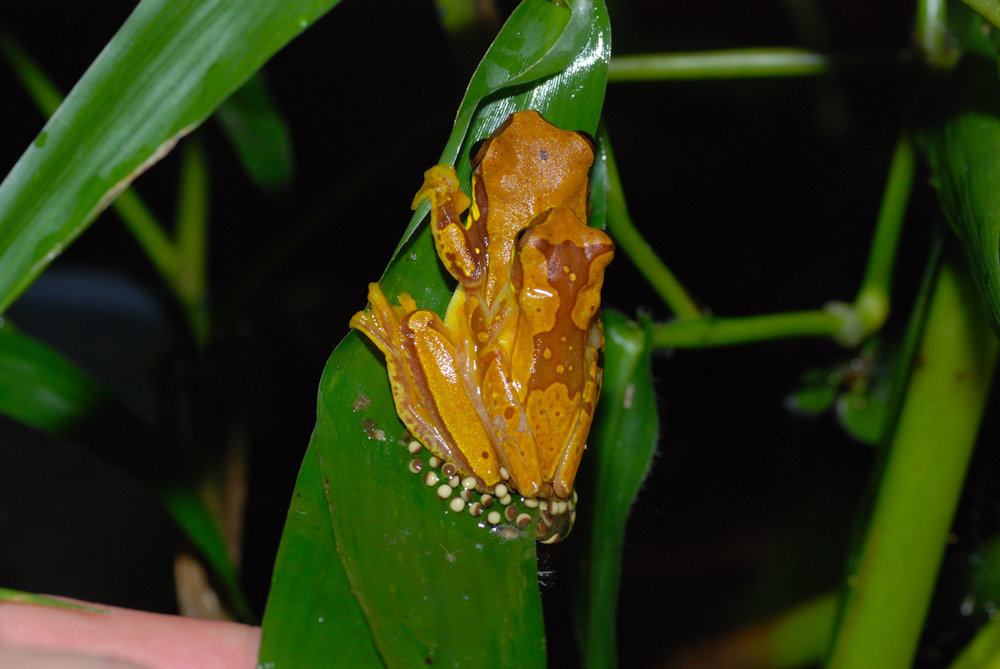 Pantless tree frogs, Dendropsophus ebraccatus, in amplexus. The female, underneath the male, is laying eggs in a jelly-like matrix. This species can lay its eggs either in water or out of water.