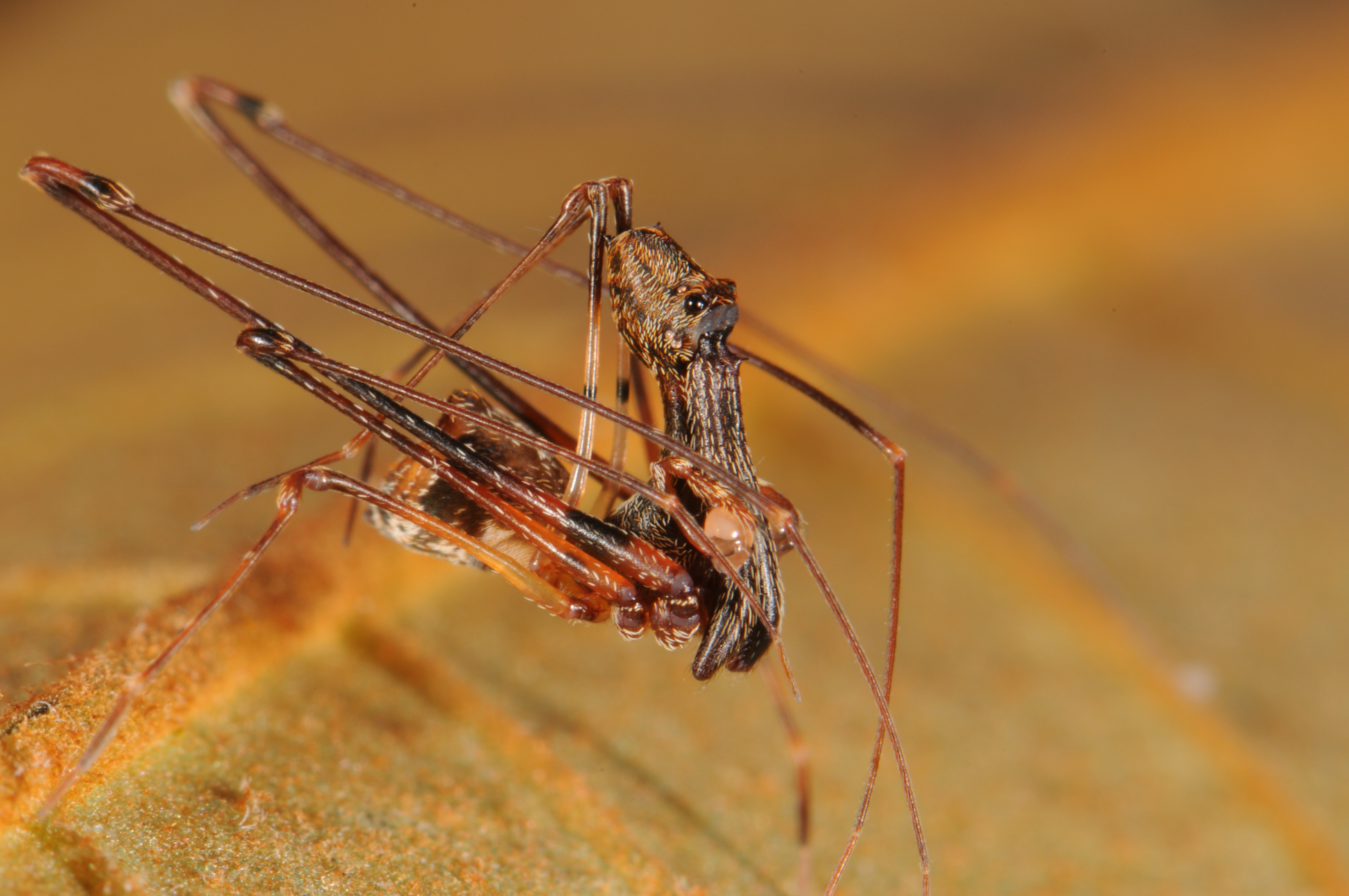 An adult male of Eriauchenius workmani. Wood redescribed this species as part of her research. This species was the first living pelican spider found in the forests of Madagascar after being known only from fossils. Later, many more living species were found in Madagascar, South Africa and Australia. Today’s pelican spiders are “living fossils,” Wood says—remarkably similar to species found preserved in the fossil record from as long as 165 million years ago. Because the living spiders were found after their ancestors had been uncovered in the fossil record and presumed extinct, they can be considered a “Lazarus” taxon.