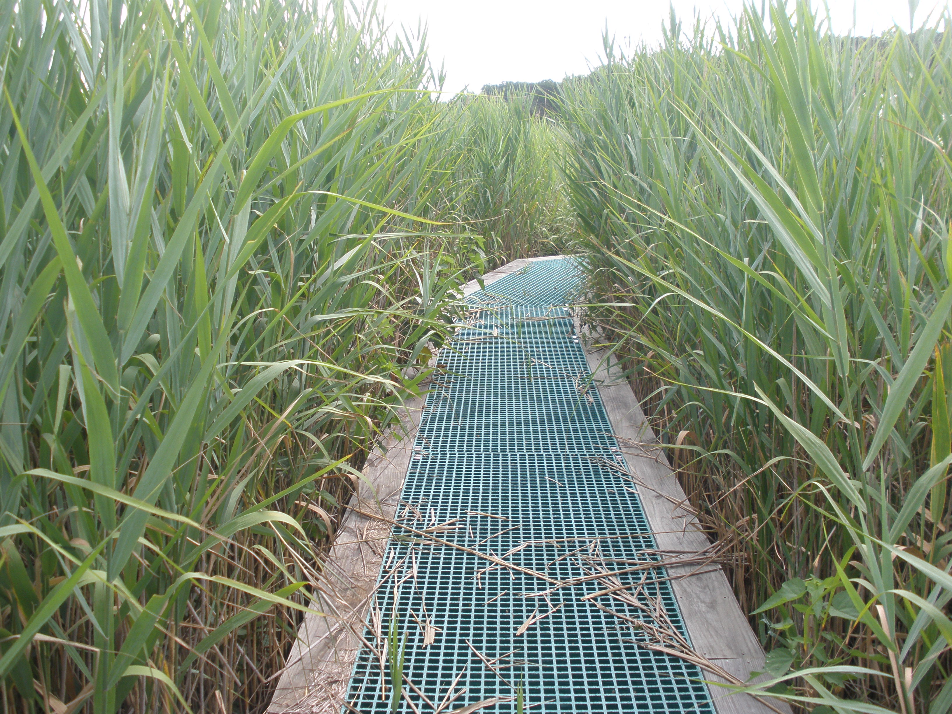 Invasive Phragmites reeds encroach on a boardwalk in a Maryland marsh. On this marsh, biologists at the Smithsonian Environmental Research Center have been conducting climate change experiments for more than 30 years.