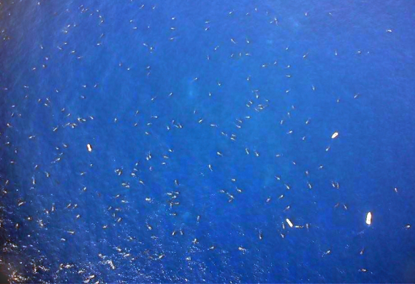 Aerial photograph of whale sharks feeding at the Afuera aggregation in August 2009, taken from approximately 600 m altitude and shows 220 whale sharks and 4 tourist boats.